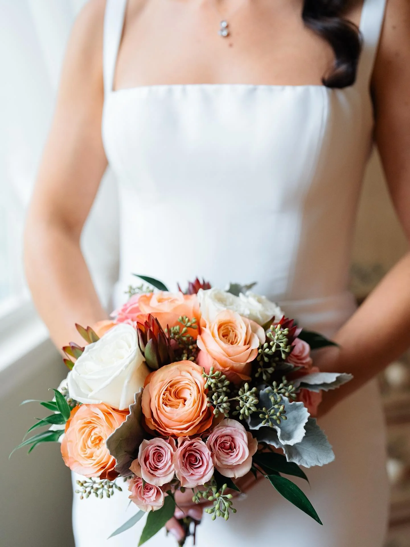 • Bride holding a bouquet of white, cream, peach, and yellow roses, with green and gray foliage, in a wedding dress with lace details.